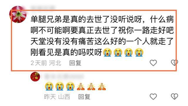 翻看其视频账号并没有发现相关的消息,由此使得部分粉丝质疑这一噩耗的真实性。不过随后有网友晒出其在另一个平台的账号内容,这才发现,原来“单腿哥”在上个月月底就因为“意外”导致离世。