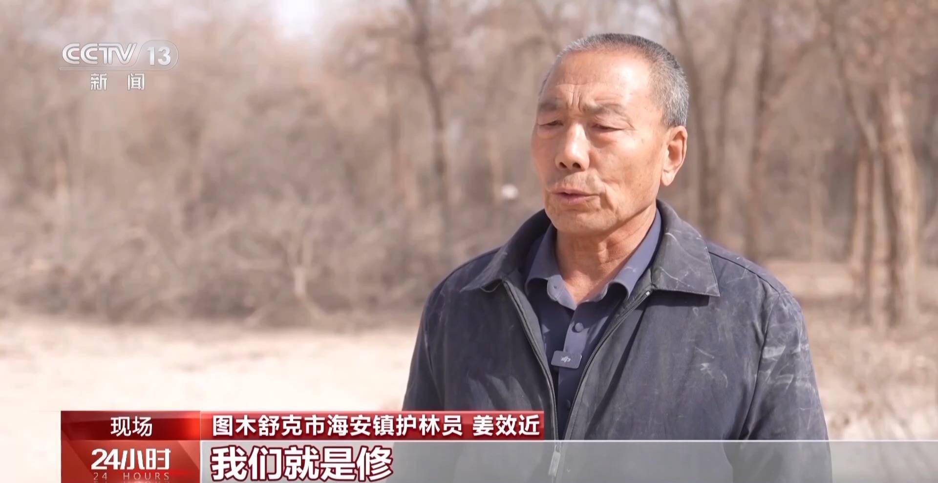 图木舒克市海安镇护林员 姜效近:我们就是修距地面2米至1.5米以下的枯枝,上面的树枝基本不动,保持树形就行了,下边的树枝最容易发生火灾,所以我们就清理下边的。