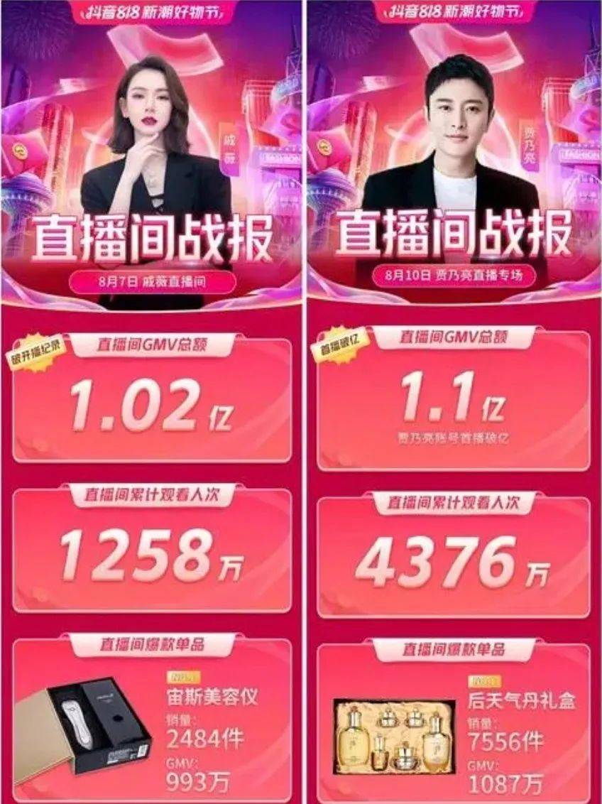 排名榜单第二位的是贾乃亮,直播4场累计销售额达到2.33亿,其中贾乃亮在抖音818期间,更实现连续两次单场GMV破亿。