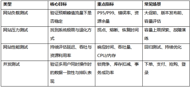 在实际沟通中,网站负载测试、网站压力测试、网站性能测试与并发测试常被混用。为了避免测试目标跑偏,可以先用下表快速区分: