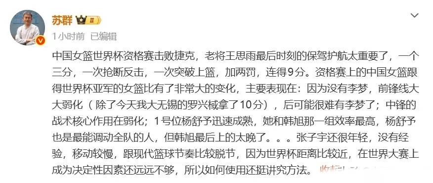 知名篮球评论员苏群一针见血:“她还很年轻, 没有经验, 移动较慢, 跟现代篮球节奏比较脱节!因为世界杯距离比较近, 在世界大赛上成为决定性因素还远远不够, 所以如何使用还挺讲究方法。”